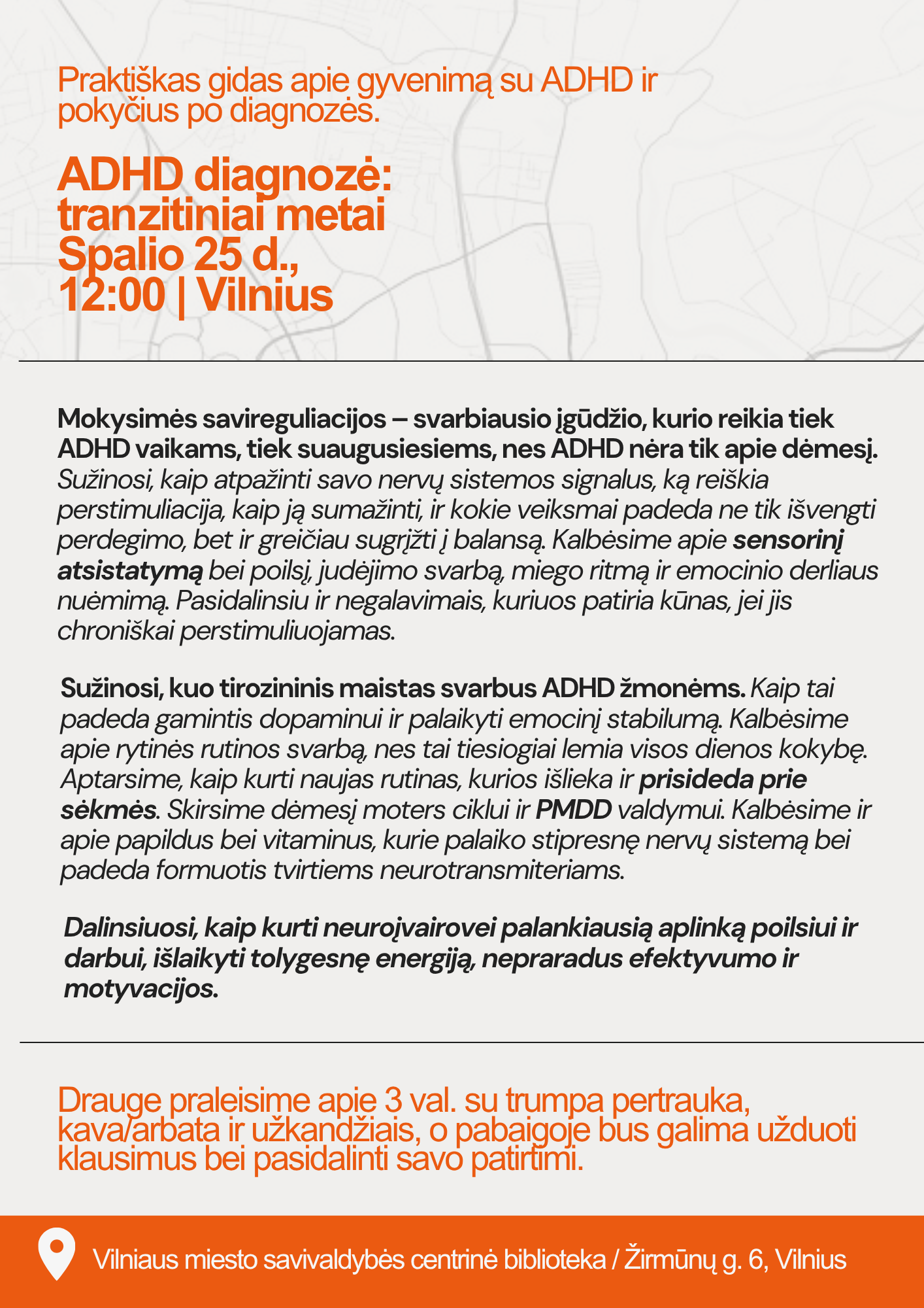 Jei šiose eilutėse radai save ir nori aiškumo po savos diagnozės, nuoširdžiai kviečiu Spalio 25d. į Tranzitinius metus, kur pasakosiu ir dalinsiuosi visomis sukauptomis žiniomis ir praktiniais patarimais, kaip išjudėti iš ADHD nežinios.