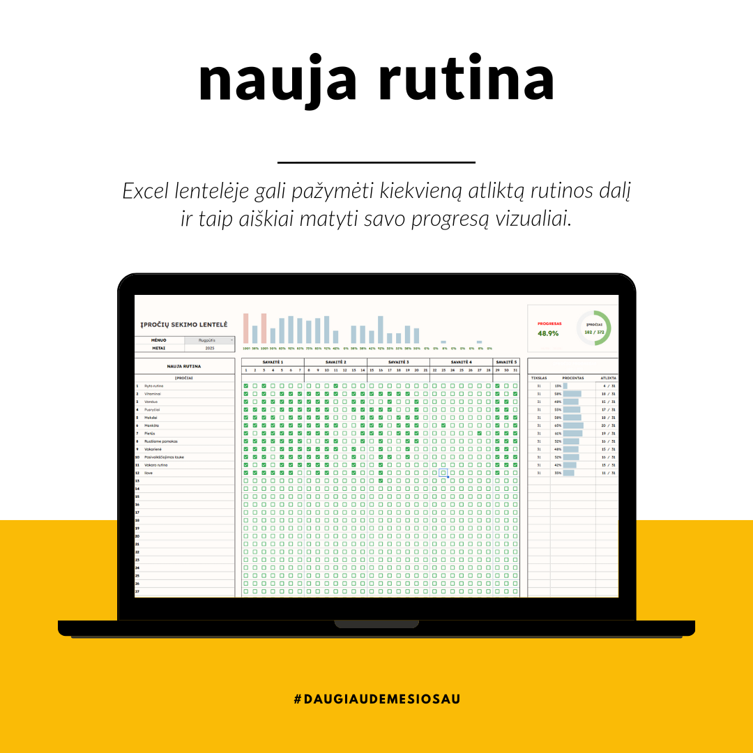 Ir per dvejus metus tai virto raumenine atmintimi ir tikrai jausdavau nerimą, jei kurio punkto trūksta arba tiesiog diena paplaukdavo savaime… ir aš į excelį nepripaukščiuodavau