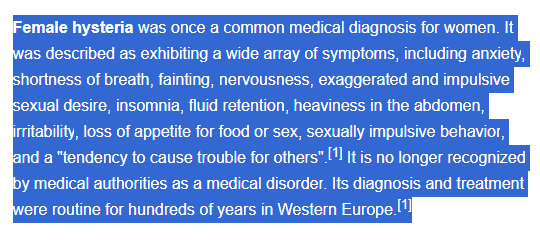 „Moteriška isterija“ kadaise buvo viena dažniausių medicininių diagnozių moterims. Jai priskirdavo ištisą spektrą simptomų – nuo nerimo, dusulio, alpimo, nervingumo iki nemigos, dirglumo, apetito ar lytinio potraukio svyravimų, impulsyvaus elgesio ir net „polinkio kelti rūpesčių kitiems“. Šiandien tai nebelaikoma medicininiu sutrikimu, tačiau diagnozė ir jos „nepadorus gydymas“ šimtmečiais buvo įprasta praktika Vakarų Europoje.